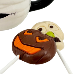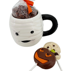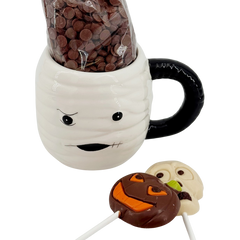 Gruselig und lecker! Unsere Mumien-Tasse ist mit cremigen belgischen Zartbitterschokoladentropfen und lustigen Lutschern gefüllt. Ein perfektes Halloween-Geschenk für Kinder und Schokoladenliebhaber.