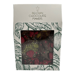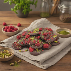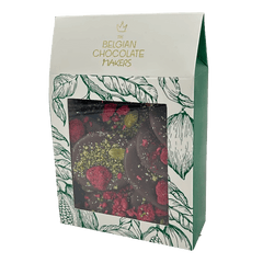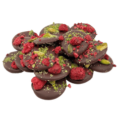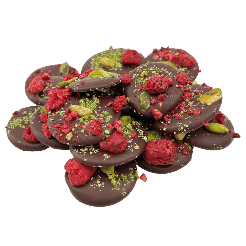 Köstliche 150 g dunkle Schokoladenmendiants mit Himbeer- und Pistazienstückchen, eine perfekte Mischung aus reichhaltigem Kakao und knusprigem Genuss.