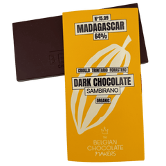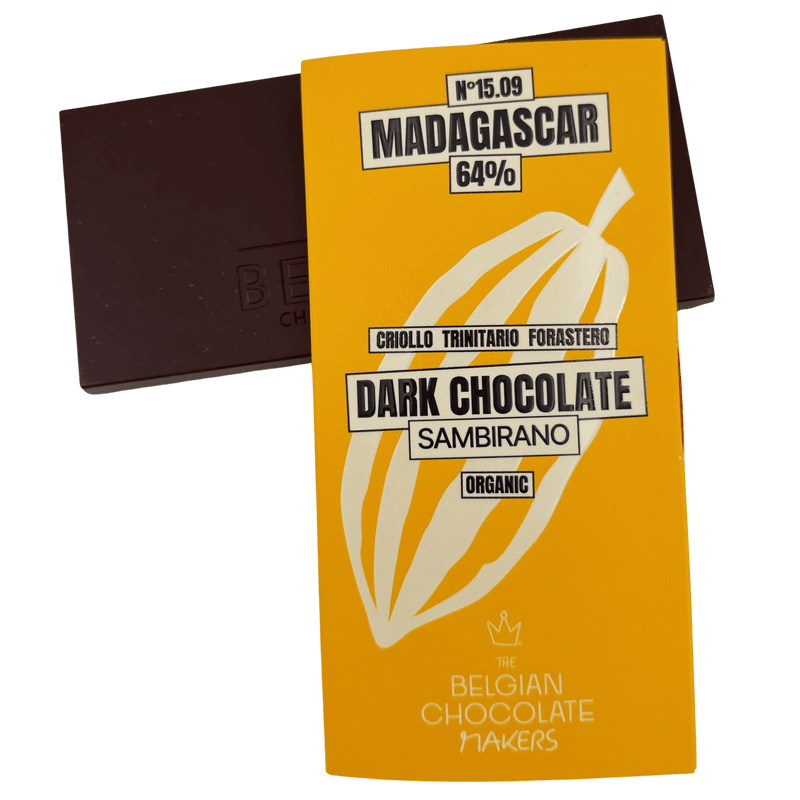 Sambirano aus Madagaskar, 64%ige Zartbitterschokolade, handgefertigt in Brüssel aus sortenreinem Kakao. Eine lebendige Bar mit fruchtigen Noten und zarte Balance.