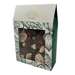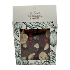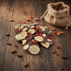 Köstliche 150g Milchschokoladen-Mendiants mit Bananen-, Mandel- und Pekannussstückchen, eine perfekte Mischung aus reichhaltigem Kakao und knusprigem Genuss.