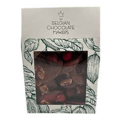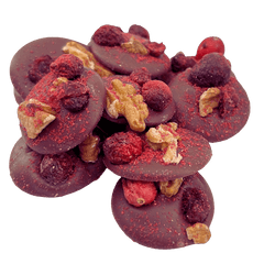 Köstliche 150g Vollmilchschokolade mit Walnuss-, Cranberry-, Johannisbeer- und Himbeerstückchen, eine perfekte Mischung aus reichhaltigem Kakao und knusprigem Genuss.