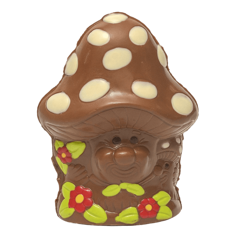Entdecken Sie unseren lächelnden Milchschokoladenpilz 160g, handgefertigt aus belgischer Schokolade. Eine verspielte und köstliche Figur, perfekt zum Verschenken oder Verwöhnen.