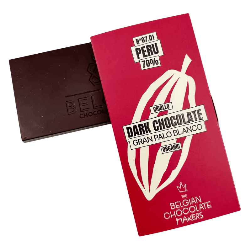 Peru Gran Palo Blanco 70%ige Zartbitterschokolade, handgefertigt in Brüssel aus herkunftsreinem Kakao. Eine seltene Tafel mit zarten blumigen Noten und raffinierter Komplexität.
