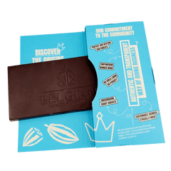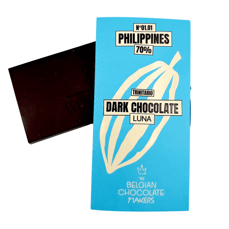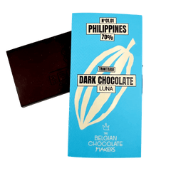 Philippinen Luna 70%ige Zartbitterschokolade, eine exklusive Kreation aus einer einzigen Sorte, die in Brüssel handgefertigt wird. Seltener Kakao mit eleganten tropischen Noten und raffinierter Tiefe.