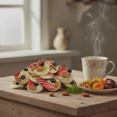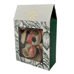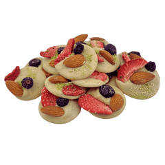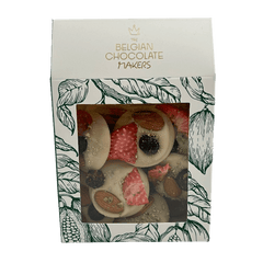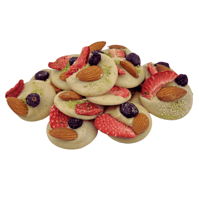 Köstliche 150 g weiße Schokoladenmendiants mit Pistazien-, Mandel-, Erdbeer- und schwarzen Johannisbeerstückchen, eine perfekte Mischung aus reichhaltigem Kakao und knusprigem Genuss.
