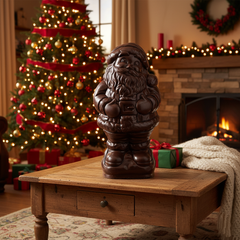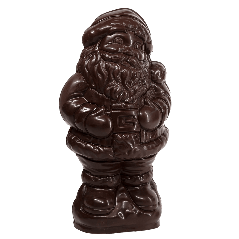 Celebra la temporada con Papá Noel, un chocolate negro belga artesanal de Bruselas de 3 kg, elaborado con granos de cacao de Filipinas. Un centro de mesa festivo y un delicioso capricho navideño.