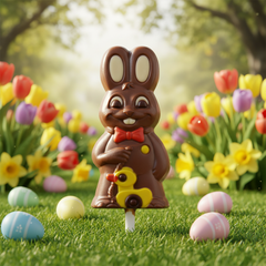 Conejito de chocolate con leche hecho a mano con piruleta de juguete, una divertida y deliciosa golosina artesanal, perfecta para las celebraciones de Pascua.