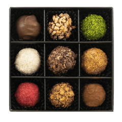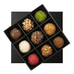 Laissez-vous tenter par l'élégance pure avec notre boîte Tentation noire , 9 truffes exquises au chocolat belge (135g) fabriquées à la main à partir de
