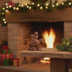 Découvrez la magie de notre Saint Nicolas en chocolat au lait 230 g chevauchant son cheval, fabriqué à la main en Belgique à partir d'un riche cacao de qualité supérieure, une création festive majestueuse pleine de tradition et de saveur.