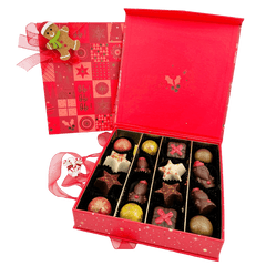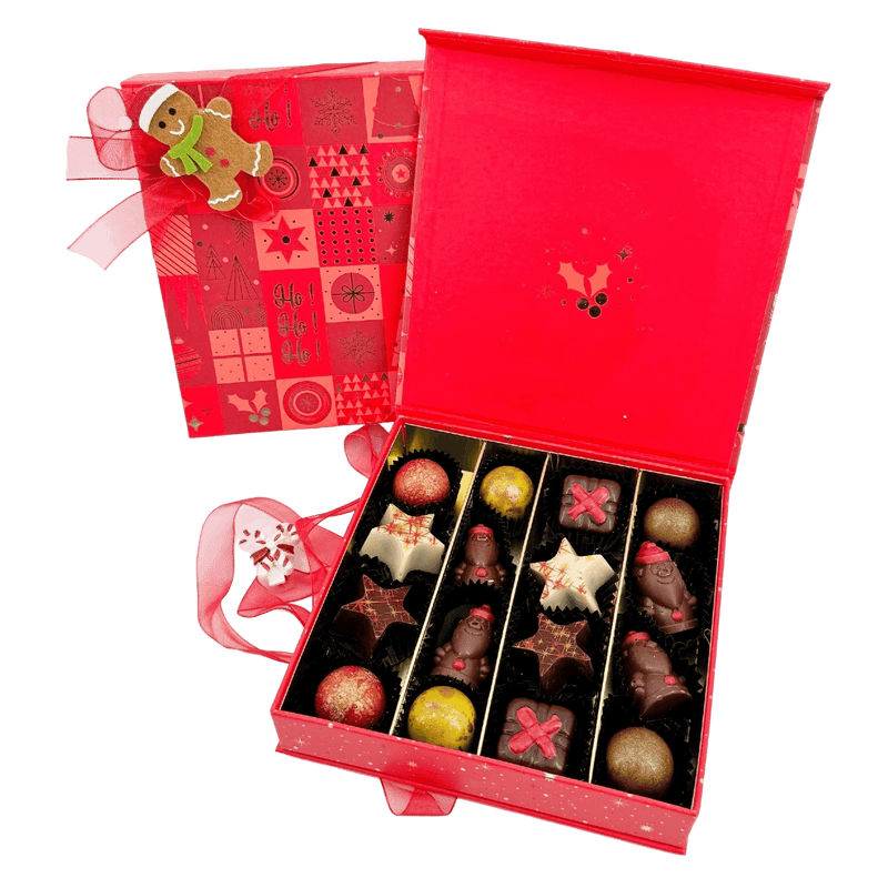 Condividete la gioia del Natale con la nostra scatola di cioccolato Ho-Ho-Ho, riempita con 16 praline belghe artigianali (240 g). Un assortimento festoso realizzato con cacao etico e passione artigianale a Bruxelles.