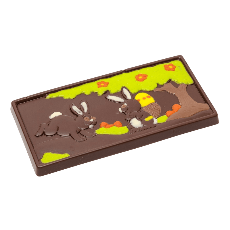 Godetevi la nostra tavoletta pasquale di cioccolato fondente da 120 g, prodotta artigianalmente in Belgio con cacao di prima qualità, una creazione ricca ed elegante che cattura lo spirito della Pasqua in ogni morso.
