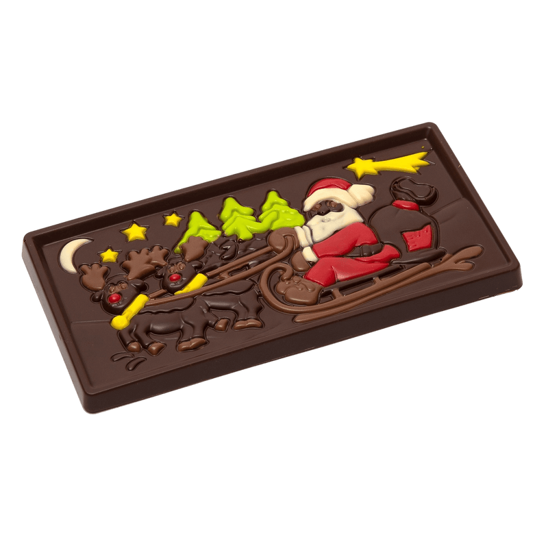 Godetevi la magia del Natale con la nostra tavoletta di cioccolato fondente Babbo Natale in slitta. Prodotta a mano in Belgio con cacao di origine pura, per una delizia golosa e festosa