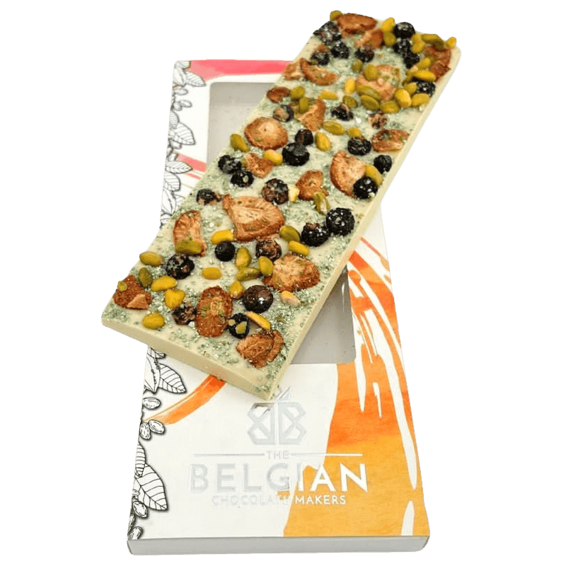 Concedetevi la nostra tavoletta di cioccolato bianco Fantasy da 550 g, lavorata a mano con croccanti pistacchi, dolci fragole e pezzetti di mirtillo. Una delizia golosa di dimensioni eccessive, perfetta per essere condivisa o regalata.