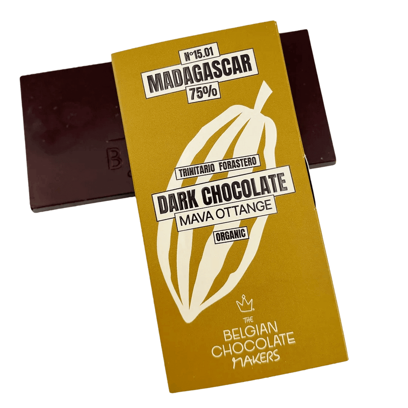 Cioccolato fondente Madagascar Mava Ottange 75%, prodotto artigianalmente a Bruxelles con cacao monorigine. Una tavoletta raffinata con luminose note fruttate e un'elegante complessità.