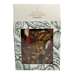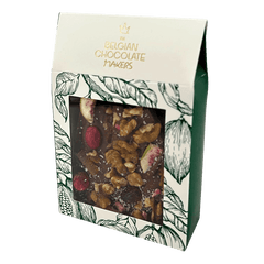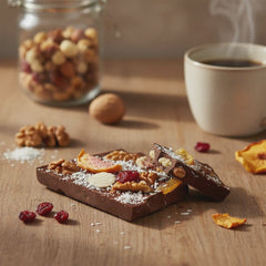 Tavolette di cioccolato al latte spezzettate artigianalmente con fichi, limone, mirtilli rossi, noci e cocco. Prodotte con cacao pregiato proveniente da Haiti, offrono una delizia da intenditori morbida, fruttata e con nocciole