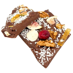 Tavolette spezzate di cioccolato al latte con fichi, limone, mirtilli rossi, noci, cocco