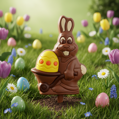 Coniglietto artigianale di cioccolato al latte con lecca-lecca all'uovo, un divertente e delizioso dolcetto artigianale, perfetto per le celebrazioni pasquali.