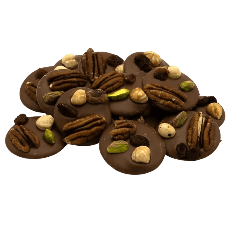 Deliziosi mendiants al cioccolato al latte da 150 g con pezzetti di noci pecan, pistacchi, uvetta e nocciole, un mix perfetto di cacao e croccantezza.