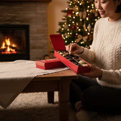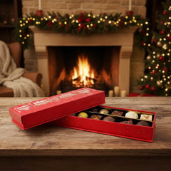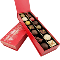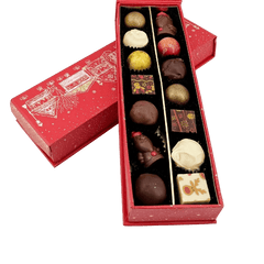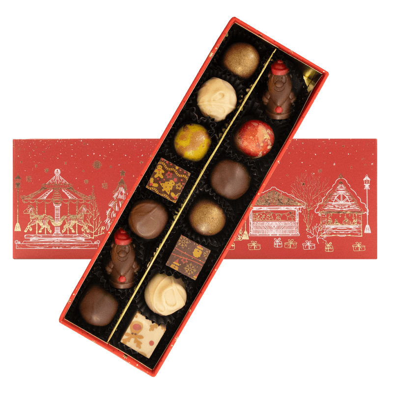 Vier de magie van Kerstmis met onze Christmas Village Box, een selectie van 225 g van 14 handgemaakte Belgische pralines en truffels. Een heerlijk feestelijk geschenk gemaakt met ethische cacao en pure artisticiteit.