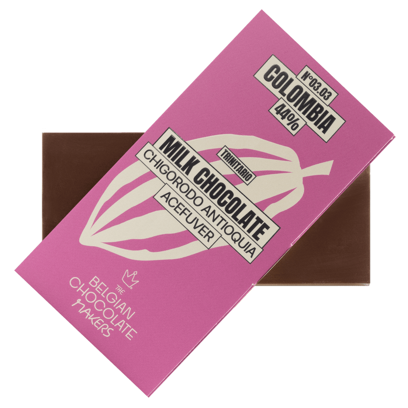 Colombia Chigorodó Antioquia Acefuver 44% melkchocolade, met de hand gemaakt in Brussel van cacao van één enkele origine. Een zachte reep met delicate fruit- en karameltoetsen.