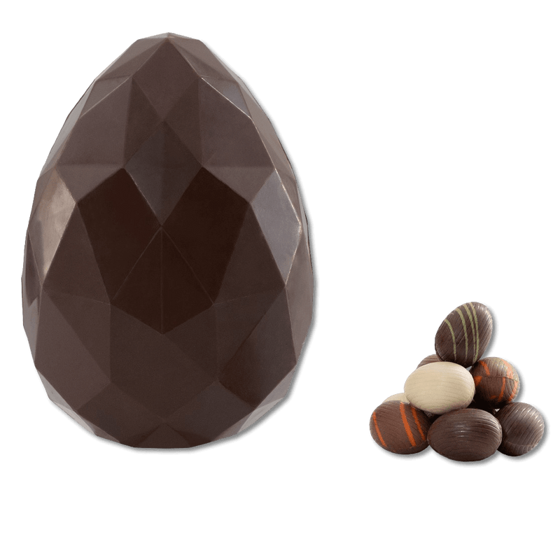 Combining artistic craftsmanship with the authentic taste of premium Belgian chocolate, this diamond dark chocolate Easter egg with mini eggs is a sophisticated and delicious centerpiece for your Easter celebrations.