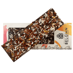 Geniet van onze Fantasy pure chocoladereep 550g, verrijkt met pecannoten, gojibessen, citroen en amandelstukjes. Een oversized Belgische lekkernij voor fijnproevers, perfect om te delen of cadeau te geven.