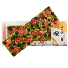 Ingredients: Rietsuiker, cacaoboter, MELKpoeder, PISTACHIOS, aardbei, bosbes, zonnebloemlecithine, Bourbon vanille uit Madagaskar.