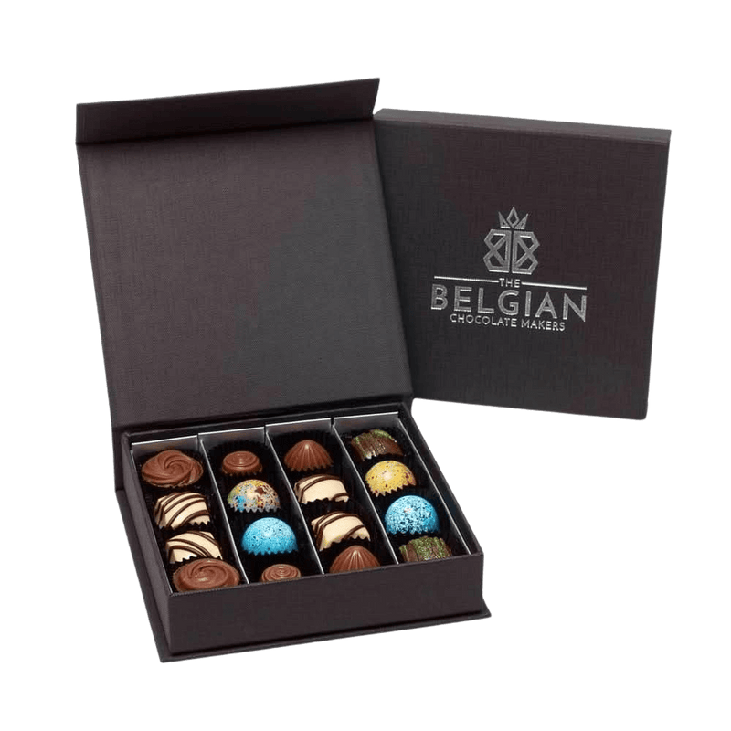 Verwen uzelf met onze luxe doos van 16 Belgische chocoladepralines in verschillende smaken, handgemaakt in Brussel met ethische cacao. Een verfijnd geschenk of een gastronomische traktatie.