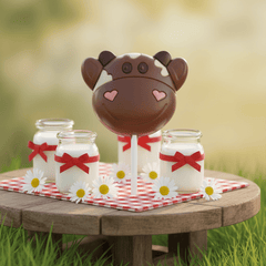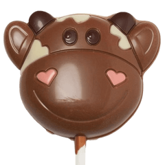 Handgemaakte melkchocoladelolly in de vorm van een koe. Een leuke, romige en heerlijke traktatie voor kinderen, feestjes of een zoet Belgisch chocoladecadeau.
