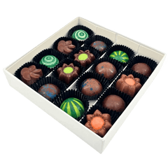 Ingredients: Suiker, cacaoboter, cacaomassa, melkpoeder, perenpuree, aardbeienpuree, bosbessenpuree, passievruchtenpuree, kalamansipuree, amandel, hazelnoot, oranjebloesemwaterextract (oranjebloesemhydrosol, ethanol), limoensap, room, sorbitol, glucosestroop, boter, Madagaskar bourbon vanille, zonnebloemlecithine, zout, kaliumsorbaat.