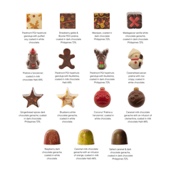 Ingredients: Sugar, cocoa butter, cocoa mass, milk powder, almond, hazelnuts, cream, orange, pecans, sorbitol, glucose syrup, butter, raspberry juice and pulp, citric acid (E330), pectin (E440), flavors, colors: anthocyanins and curcumin, sunflower lecithin, Madagascar bourbon vanilla, puffed soybeans, salt, rice flour, potassium sorbate.
