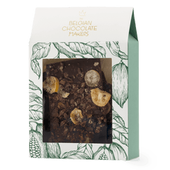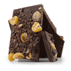 Handcrafted dark chocolate broken bars with kumquat and cacao nibs. Made with premium cocoa from the Philippines, offering a rich, fruity, and nutty gourmet experience.