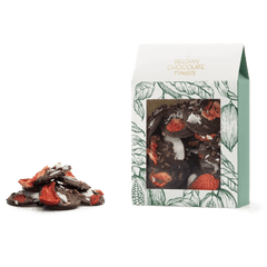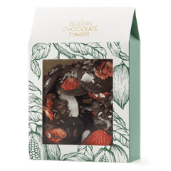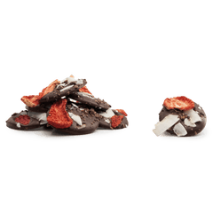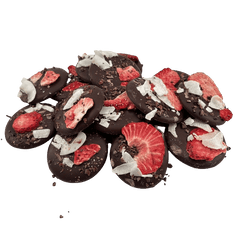 Delicious 150g dark chocolate mendiants topped with cacao nibs, strawberry and coconut chunks, a perfect blend of rich cocoa and crunchy goodness.