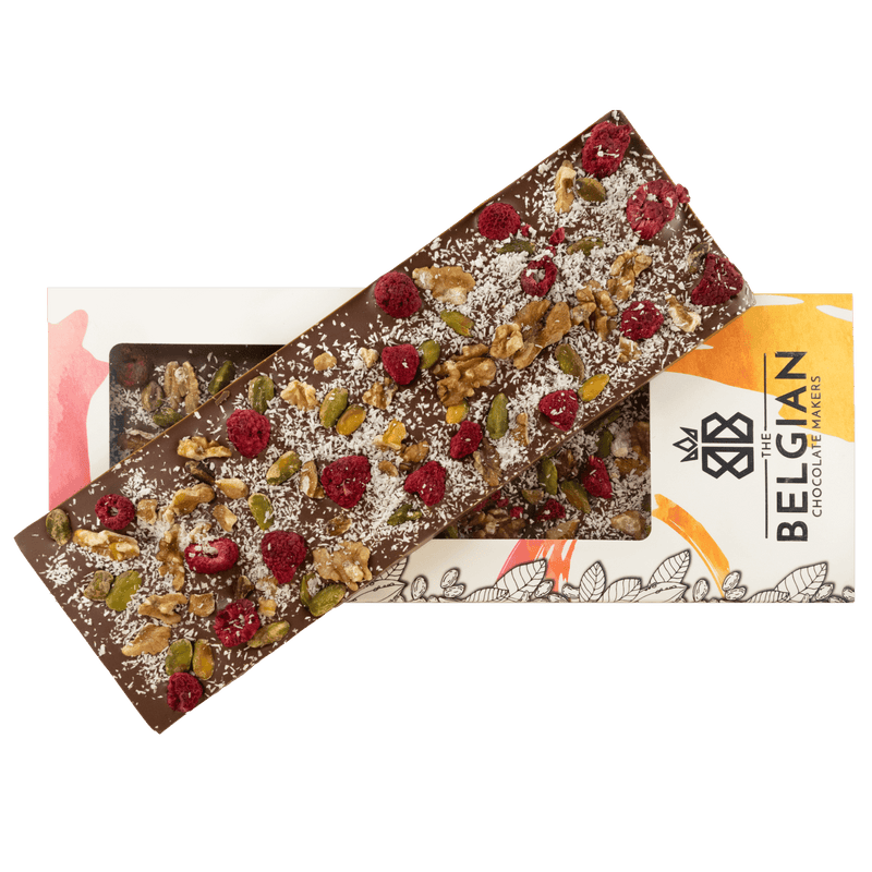 Savor our Fantasy milk chocolate bar 375g, crafted with walnut, pistachio, raspberry and coconut chunks. An indulgent oversized Belgian treat, perfect for gifting or sharing.