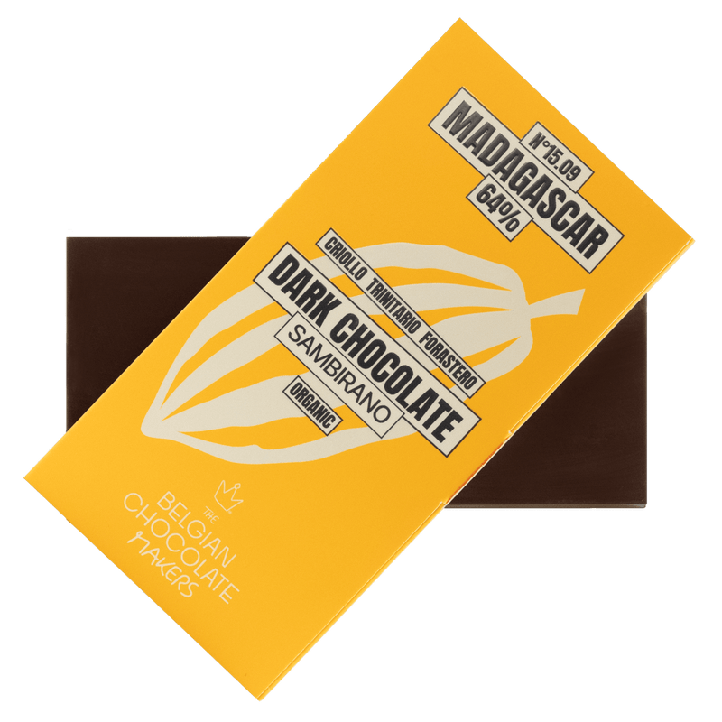 Madagascar Sambirano 64% dark chocolate, handcrafted in Brussels from single-origin cacao. A vibrant bar with fruity notes and delicate balance.
