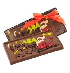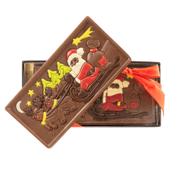Enjoy the magic of Christmas with our Santa Claus on a sledge milk chocolate bar. Handcrafted in Belgium from pure origin cacao for a festive gourmet treat.