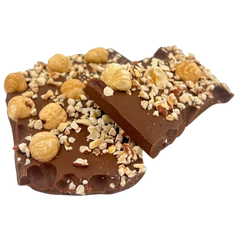 Handcrafted milk chocolate broken bars with hazelnut. Made with fine cocoa from Haiti, delivering a smooth, fruity, and nutty gourmet delight.