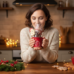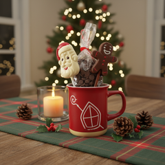 Enjoy our 200g milk chocolate drops in a festive Saint Nicholas mug, handcrafted in Belgium, a charming gift combining creamy cocoa delights and a collectible holiday keepsake.
