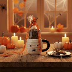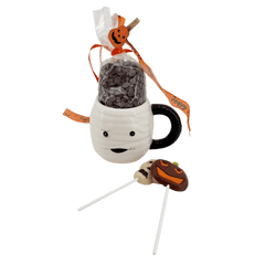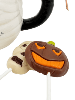 Spooky and delicious! Our mummy-themed cup is filled with creamy Belgian milk chocolate drops and fun lollipops. A perfect Halloween gift for kids and chocolate lovers.