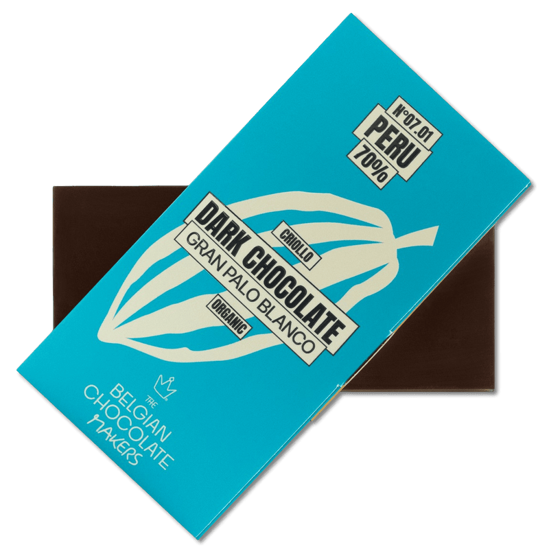 Peru Gran Palo Blanco 70% dark chocolate, handcrafted in Brussels from single-origin cacao. A rare bar with delicate floral notes and refined complexity.