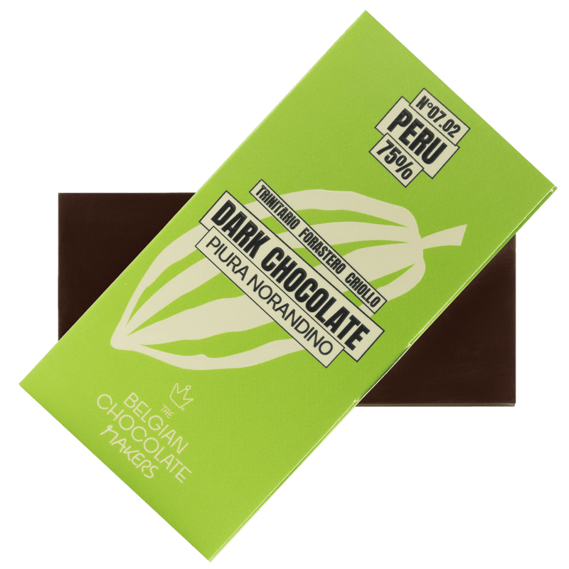 Peru Piura Norandino 75% dark chocolate, handcrafted in Brussels from single-origin cacao. A rare bar with delicate fruity notes and refined elegance.