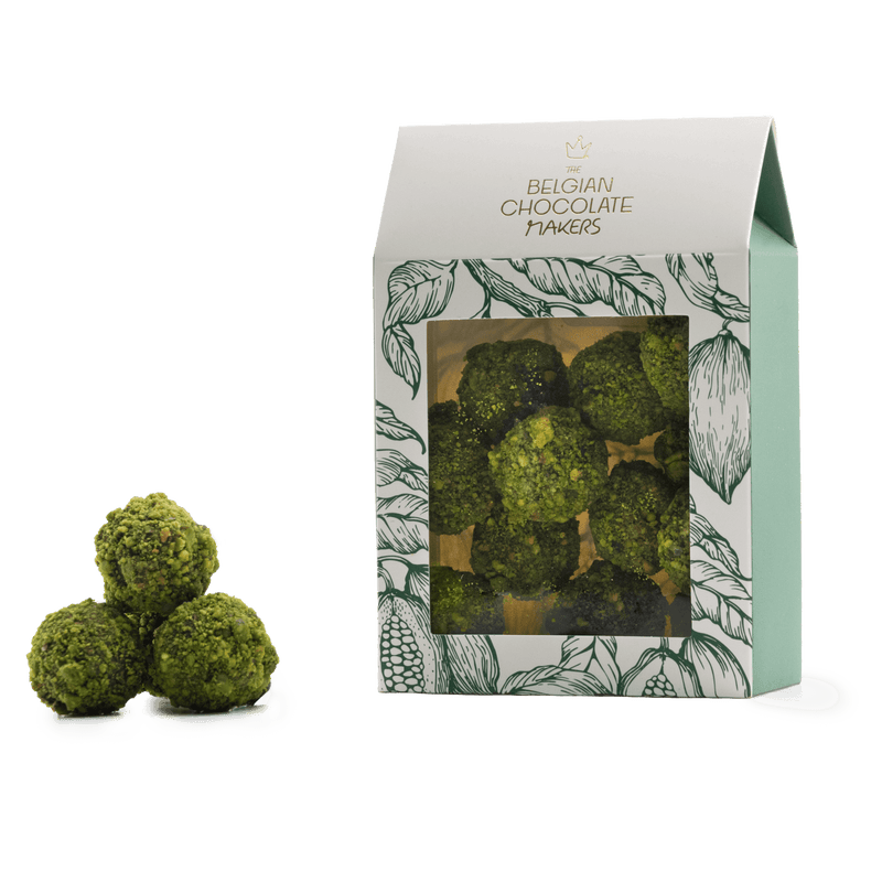 Indulge in our 160g pouch of Belgian chocolate truffles with pistachio. Handcrafted in Brussels, combining rich cacao with delicate nutty notes for a gourmet experience.