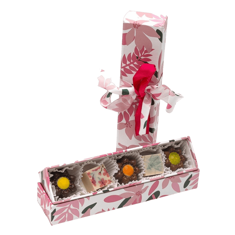 Enjoy our spring box of 5 handcrafted Belgian pralines (75g). Made in Brussels with premium, traceable cacao, this elegant mini-assortment is the perfect seasonal gift to celebrate spring’s flavours and colours.