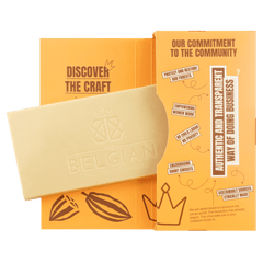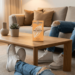 Handmade white chocolate bar with Bourbon vanilla 35%, crafted in Brussels. A 100g creation combining smooth sweetness and refined gourmet elegance.