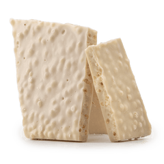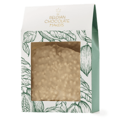 Discover our artisanal white chocolate broken bar with puffed rice, handcrafted for a creamy sweetness and light, crispy crunch in every bite.