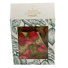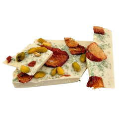 Handcrafted white chocolate broken bar with strawberries and pistachios, blending creamy sweetness with a fruity crunch.